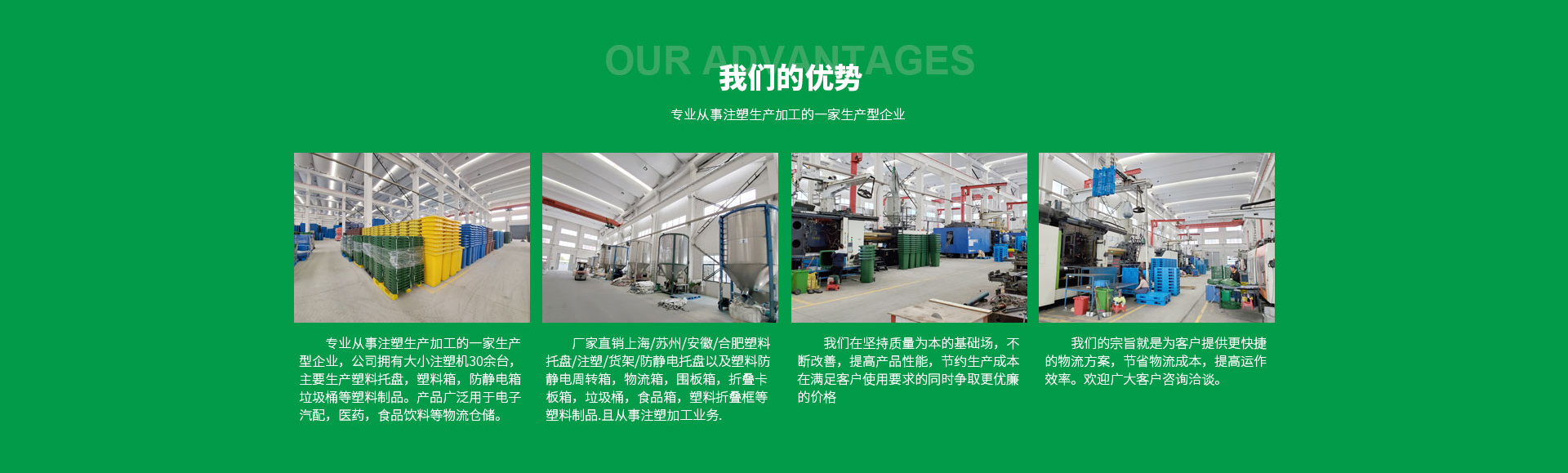 安徽華愷塑料科技有限公司是專業從事注塑生產加工的一家生產型企業,公司擁有大小注塑機30余臺,主要生產塑料托盤,塑料箱,防靜電箱,垃圾桶等塑料制品。產品廣泛用于電子,汽配,醫藥,食品飲料等物流倉儲。 安徽華愷塑料廠家直銷上海/蘇州/安徽/合肥...